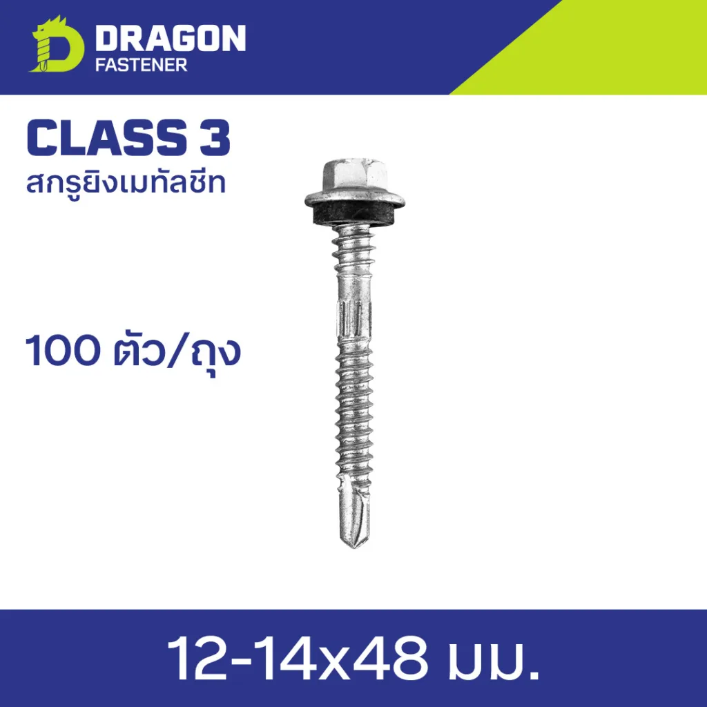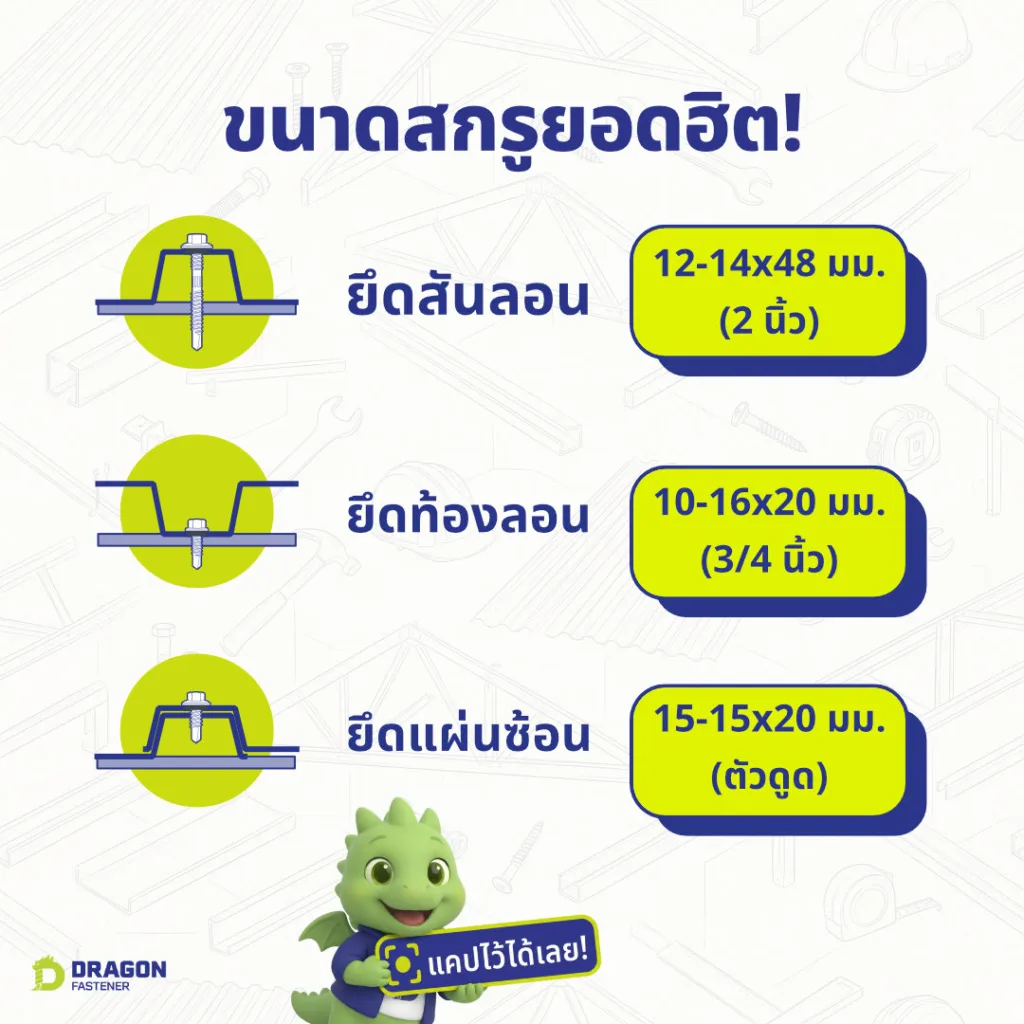นี่คือสกรูที่เราเห็นใช้ยึดเมทัลชีทด้านนอกสุดเข้ากับแปเหล็ก โดยยิงผ่านสันลอนที่สูงและฉนวนกันความร้อน (ถ้ามี) การเลือกขนาด 48 มม. (หรือ 2 นิ้ว) นี้ เป็นขนาดที่ครอบคลุมการติดตั้งทั่วไปได้ดีครับ โดยเผื่อระยะผ่านความสูงลอนและฉนวนแล้วยังสามารถทะลุแปเหล็กลงไปได้พอดี การทำความเข้าใจที่มาของความยาวสกรูที่ถูกต้องสำหรับสันลอน เป็นเรื่องที่สำคัญมากสำหรับความแข็งแรงของหลังคา คุณสามารถ คลิกอ่าน “สูตรคำนวณความยาวสกรูเมทัลชีท” แบบละเอียดที่นี่ เพื่อทำความเข้าใจหลักการทั้งหมดครับ